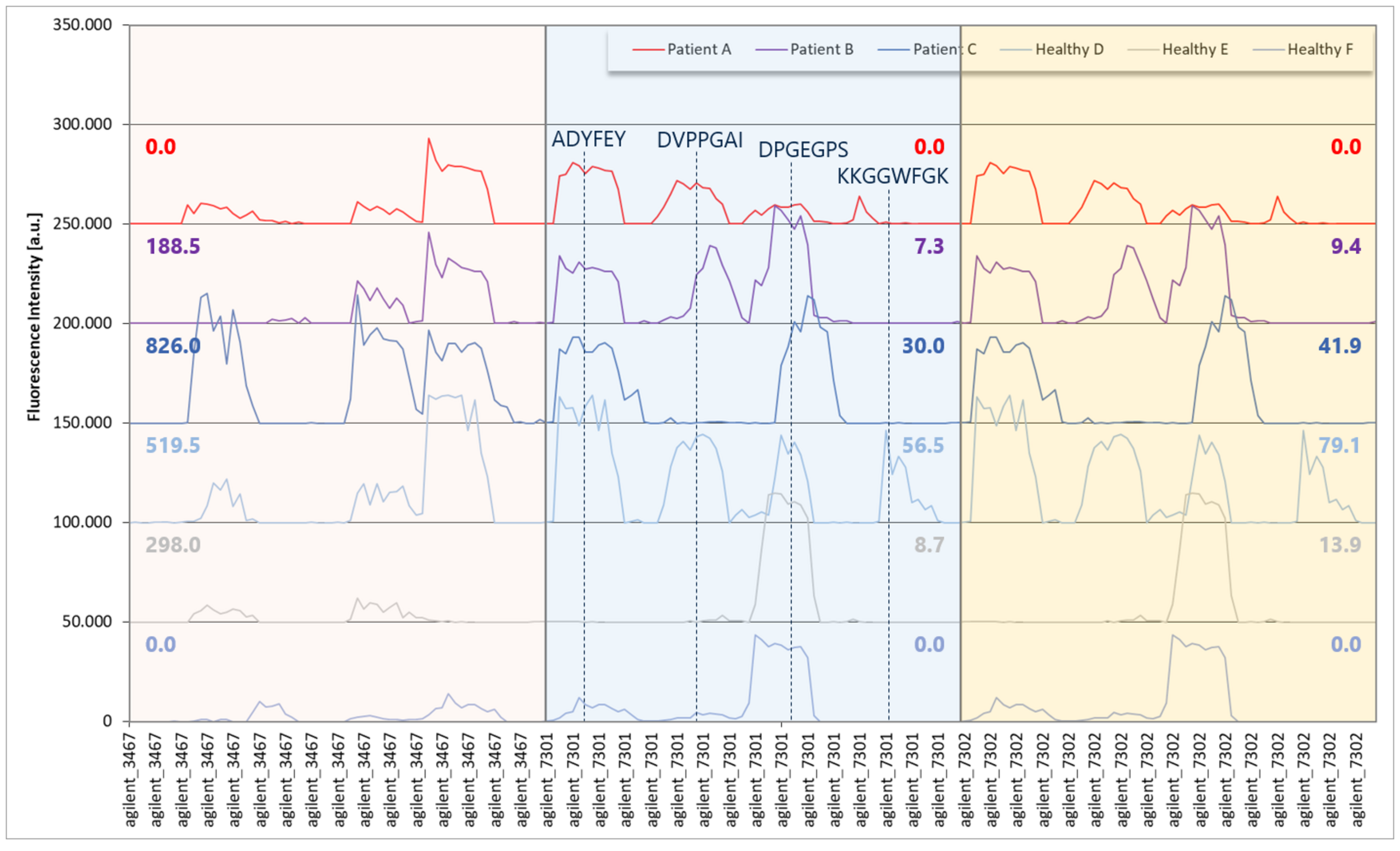 When the same sera were tested on peptide microarrays, strong and clear antibody responses were observed with multiple epitopes per PhIP-Seq hit, with high fluorescence intensities up to 40,000 units (close to the scanner’s 65,000-unit saturation threshold). Yet these responses were not always registered in the PhIP-Seq data: While no PhIP-Seq reactivity was found in Patient A or Healthy F and peptide “agilent_3467” (EBV EBNA1), the peptide microarray data revealed a widely identical reactivity compared to Patient B and Healthy E with 2 and 3 separated epitopes, respectively. A similar finding was observed with PhIP-Seq peptide “agilent_7301” (EBV EBNA1) with no PhIP-Seq in Patient A or Healthy F and a widely identical peptide microarray reactivity compared to Patient B and Healthy E.